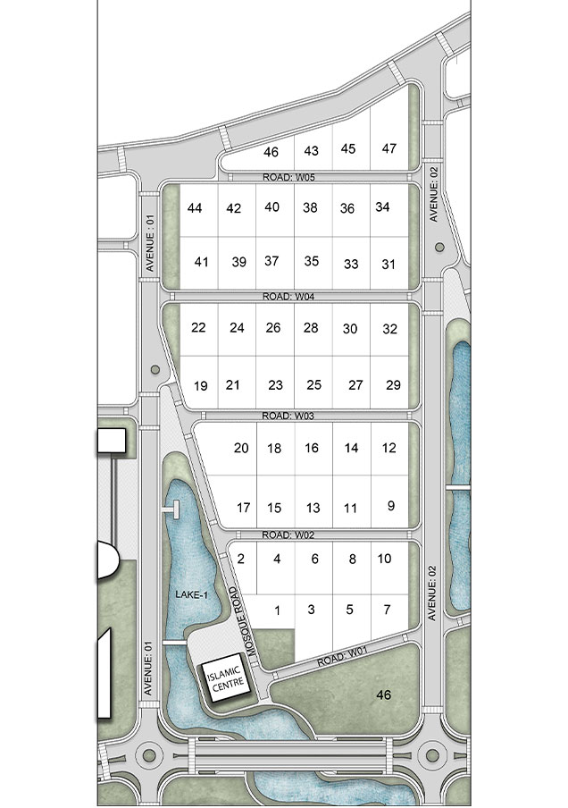 Sector WESTVILLE is thoughtfully designed to feature an Islamic Center with a mosque, set within a peaceful landscape of indigenous plants, a lake, pedestrian walkways, and public spaces. The area is well-connected, bordered by GRANVILLE Avenue, a secondary avenue, and a 60-foot-wide peripheral road, ensuring easy access throughout the community. WESTVILLE aims to be a model of sustainable living, integrating residential, religious, and recreational spaces into a cohesive environment. By prioritizing tranquility and accessibility, this sector promotes both spiritual enrichment and social well-being, fostering a balanced, inclusive community.